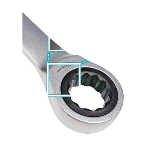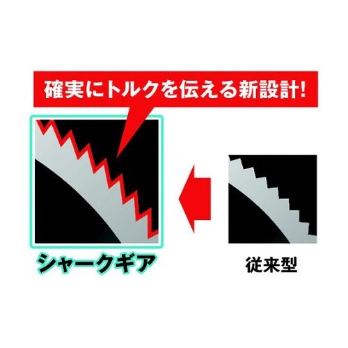 確実にトルクを伝える新設計のシャークギアが締め付けトルクをアップしました。独自機構の(シャークギア形状)100ギア仕様で作業性抜群です。スパナ部はノンスリップ加工搭載で3箇所でナットをキャッチするので |