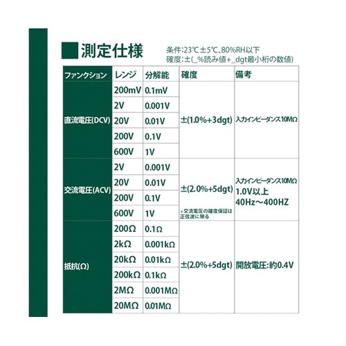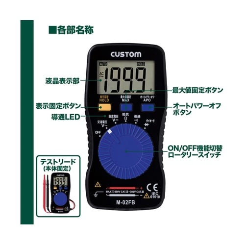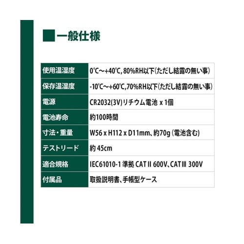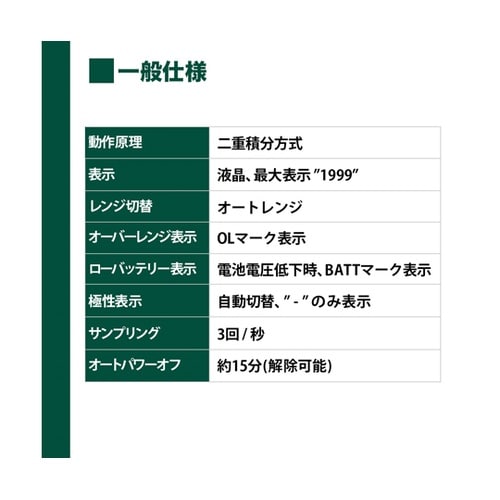 手帳型ケース付き。ディスプレイホールド機能。最大値固定(マックスホールド機能)。導通ブザーとダイオードテストも可能。電池の消耗を防ぐオートパワーオフ機能。 |
