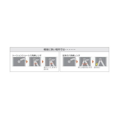 一方が対辺曲げ、もう一方が対角曲げとなっており、振り角度30°での使用が可能です。六角棒を回すスペースを十分に確保できない狭い場所での作業に便利です。硬度はHRC53−57です。トーションレンチTTX |