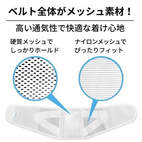 軽量メッシュで快適、補助ベルトでしっかり固定できる腰サポーター軽くてソフトな着け心地通気性のあるメッシュタイプ2本の、ステーが背面をしっかりサポート |