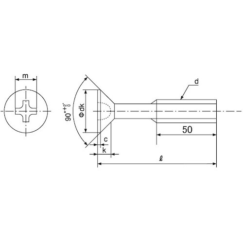 上面が平らで座面が円錐形の頭の形状です。皿小ねじは頭部も含めた全長が長さとなります。(一般的には首下部分の長さ。