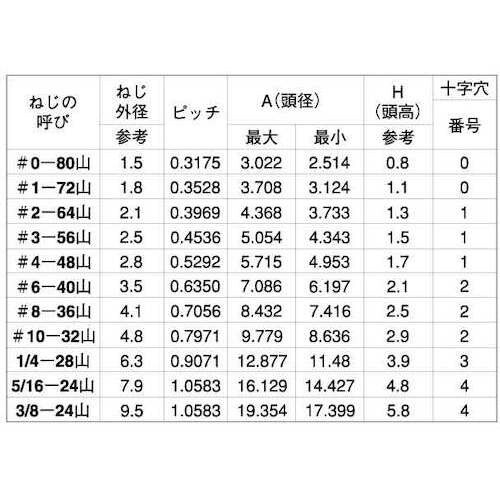 呼び(#):0 | 長さ:5・8 | その他仕様:皿小ねじ | 材質・仕上げ:ステンレス(303、304、XM7等) | 表面処理:生地(または標準)…