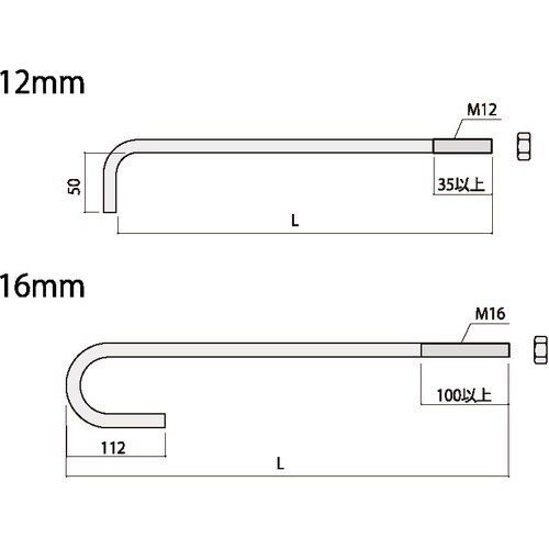 タイプ:U型 | 折り返し長さ(mm):112 | ねじ呼称(mm):M16 | 長さL(mm):800 | 材質・仕上げ:JIS B 1180 (強…