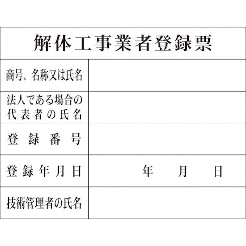 表示内容:解体工事業者登録票 | 取付仕様:ビスまたはテープ止め(ビス、テープ別売) | 縦(mm):400 | 横(mm):500 | 厚さ(mm)…