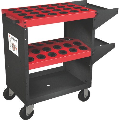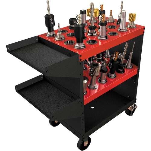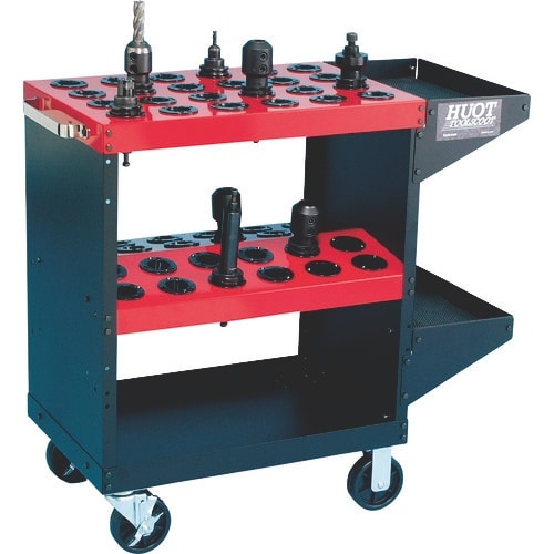 2段目は両側どちらからもツーリングが取り出しやすい角度に設計されています。サイドトレイには別売りのツーリングバイス、コレットラックが設置できます。ツーリングの収納、管理に。 |