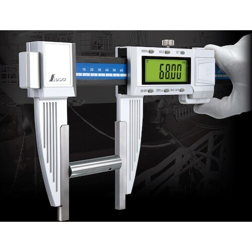 大型のノギスですが、本尺部はCFRP樹脂なので軽量です。Bluetooth通信機能付で、測定値をスマートフォンやタブレット、パソコンに送信できます。デジタルユニット部は防塵・防水性能IP65です。 |