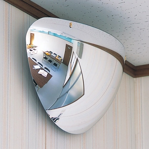 T字路の衝突防止に役立つハーフドーム型のミラーです。軽量で割れにくい安心設計で、取り付けも簡単です。グッドデザイン賞を受賞しています。屋内用。T字路の安全確認に。 |