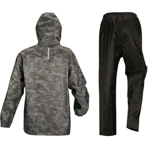 雨に偉力。機能充実のベーシックな上下裏メッシュレインスーツです。人気のワークテイスト柄をジャケットに使用しました。左胸には止水ファスナー付きポケット、背面には安全性を高めるリフレクターを付けてます。