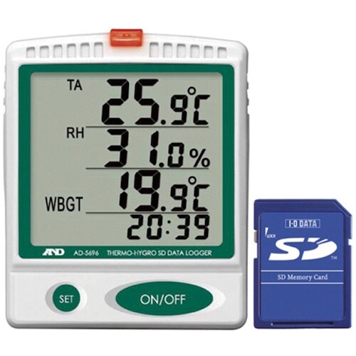 温度、湿度、WBGT指数、日付、時刻をSDカードに記録できます。空き容量1GBのSDカードで連続30年以上のデータ記録可能です。温度、湿度、WBGT指数の上限と下限アラーム設定可能です。屋内用。 |