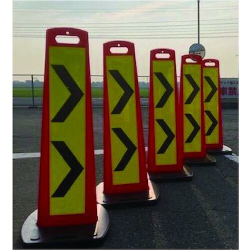 矢印板より視線が高く視認性もアップしている工事用表示板になります。両面高輝度反射で夜間でも安心です。本体とウェイトが分離式でスタックも可能で施工性も早く、すばやく設置できます。 |