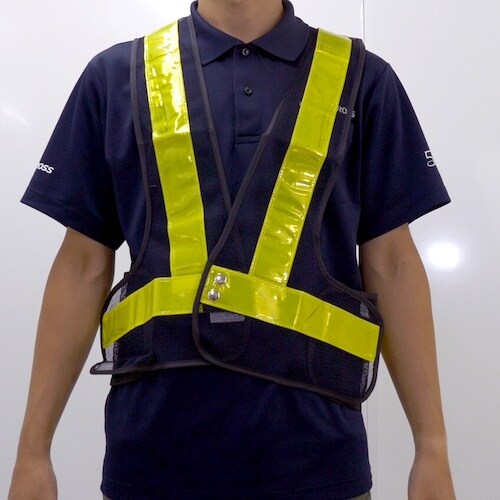 視認性の高い50mm幅のPVC反射テープを使用しています。マジックテープで簡単着脱できます。ウエストの調整も簡単です。通気性がよく、軽く、作業性にすぐれたメッシュ素材です。夜間作業に。