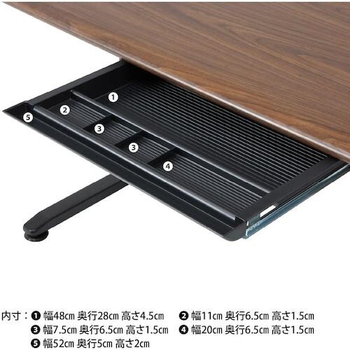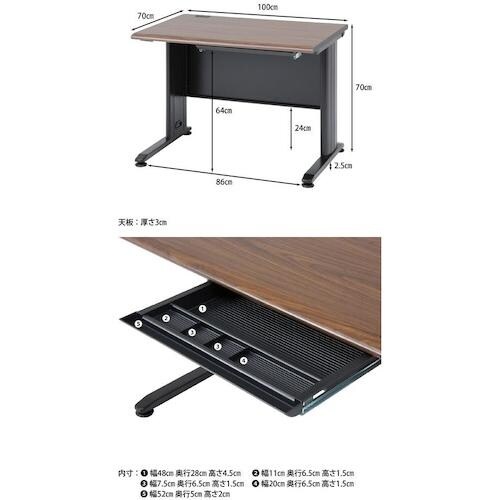 シンプルでスタイリッシュなデザインのデスクです。引き出し付きで文房具などの収納が可能です。天板にはコード通し用の穴が空いており、配線もスッキリとまとめることができます。 |