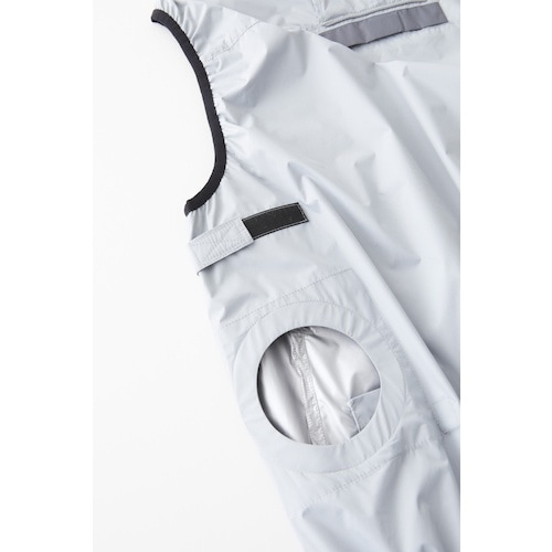 軽量ポリエステル素材を使用したストレスフリーな着心地です。高い紫外線カット率で日焼けを防止します。裏側シルバーコーティングの遮熱生地を使用しています。運転などの動作を妨げない横付ファン仕様です。