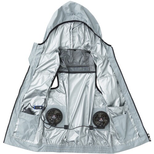 軽量ポリエステル素材を使用したストレスフリーな着心地です。高い紫外線カット率で日焼けを防止します。裏側シルバーコーティングの遮熱生地を使用しています。運転などの動作を妨げない横付ファン仕様です。