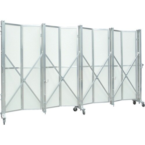 アルミ材は、独自の押出し技術によりカドを全てR仕様にすることで強度をUPさせています。重量はスチール製の約半分で操作が楽々です。別売りの目隠しパネルが取付できます。 |