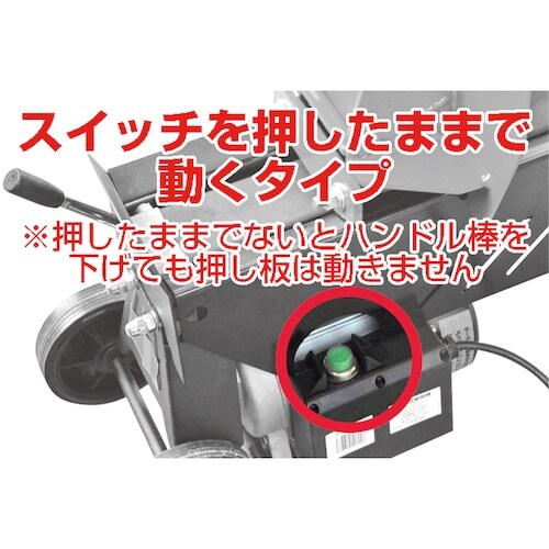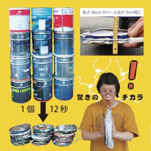 5.5tの力で、スチール缶も簡単に潰せます。缶を潰すことでスペース、処理費を削減し、12秒で高さ36cmの缶が約5cmになります。AC100v電源、移動がしやすいタイヤ付で場所を選ばず作業ができます。 |
