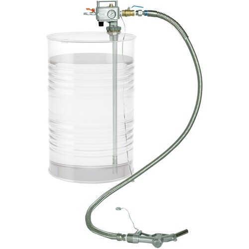 ドラム缶内に0.05Mpaに減圧したエアを挿入し、押し出すしくみのエア式ドラム缶密閉型の吐出専用ポンプです。ドラム缶口G2(50A)に取り付けて使用します。エア式のため防爆地域での使用も可能です。 |