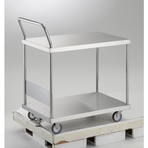 溶接構造のSUS製の2段式台車です。本体およびキャスター金具までSUS304製ですので、食品工場やクリーンルームに使用できます。ハンドル高さが1050mmと高く背の高い方も楽に使用できます。 |