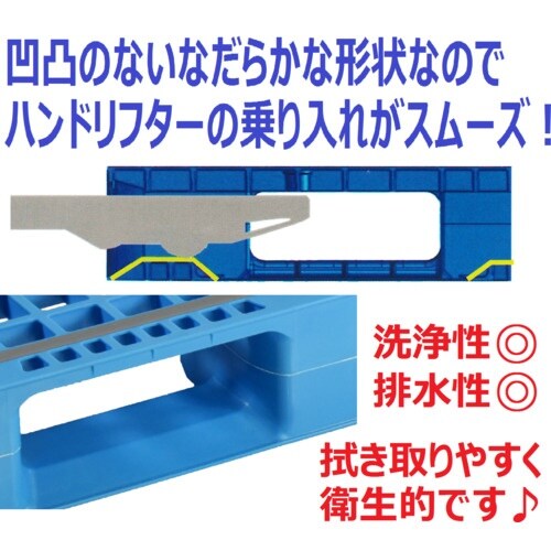 ラック保管にも対応しています。(条件は必ずご相談下さい)独自技術「ガスアシスト成形」により軽さと強さを両立したパレットです。好評の滑り止めテープ付きです。積載面メッシュで通気性に優れています。 |