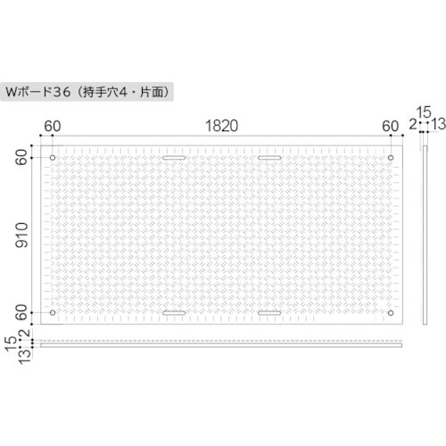 | 注意事項 | ※禁止事項:側溝や段差など敷板の下に空間がある条件での使用。クレーンのアウトリガー用敷板としての使用。軟弱地盤や崩落の恐れがある地盤での使用。製品上でのたき火、溶接火花等による火気使用。 |