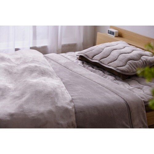なめらかな肌触りのベロア生地を使用した2枚合わせ毛布です。生地が2枚合わさっている毛布で、1枚ものと比較すると厚手であたたかさを感じます。側生地と中綿のダブル発熱であたたかく快適です。寝具に。