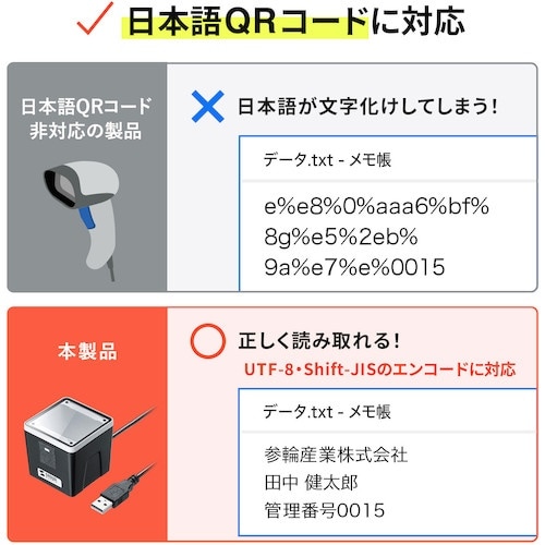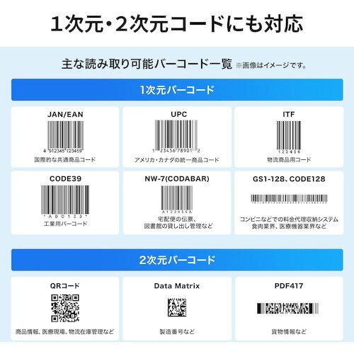 バーコードをかざして読み取れる卓上タイプのバーコードリーダーです。付属のスタンドを使えば、スタンドタイプとしても使用できます。2次元・1次元コードの読み取りに対応しています。 |