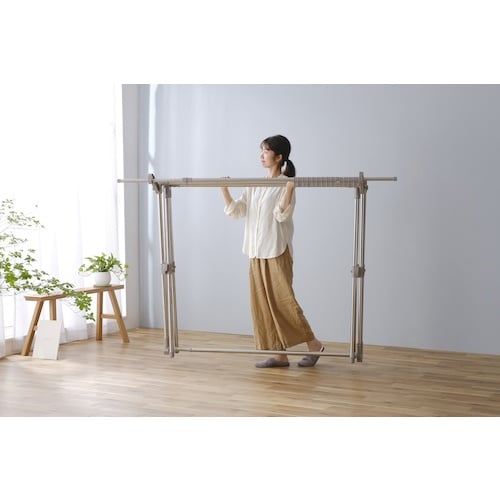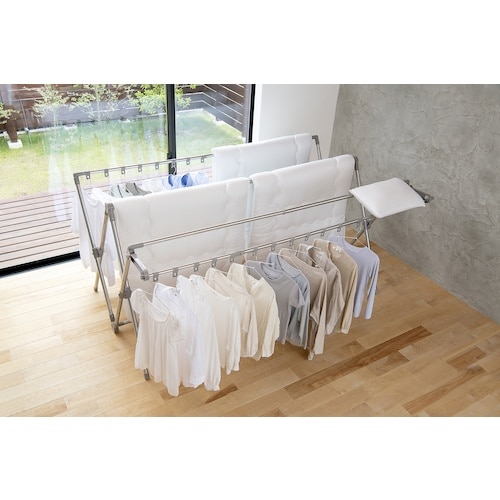 大量の洗濯物や最大6枚分の布団が干せる大容量タイプの布団干しです。洗濯物の量に合わせてパイプを伸縮させて使用できます。20個のハンガー掛け付きなので、間隔の調整が自由自在で洗濯物の片寄りも防げます。 |