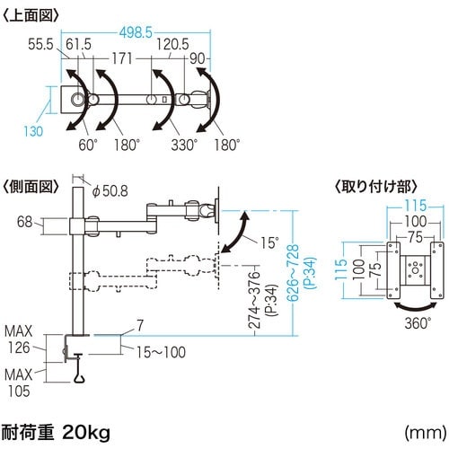 | 注意事項 | ※デスク等への設置の際はモニタの重量、アームの重量に耐えることのできる箇所へ取り付けてください。 |