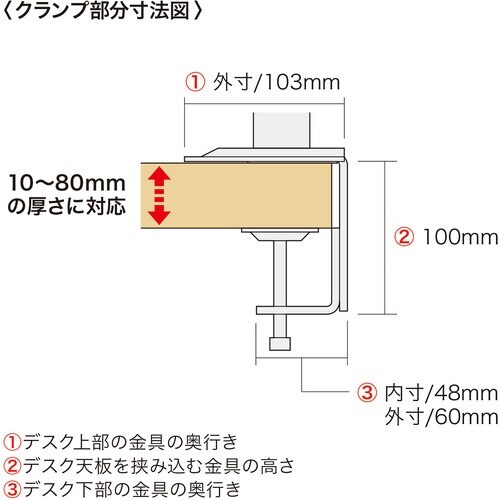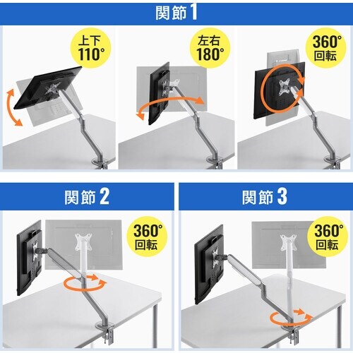 ■水平空間に対して大きく伸縮する3関節のスタイリッシュなモニターアームです。奥行きの広いデスクなどでの使用に最適です。 |