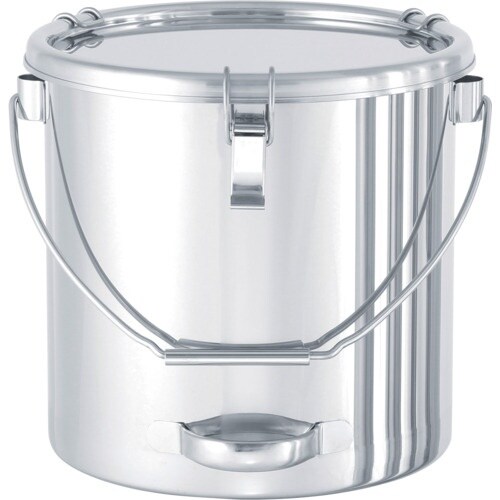 ツル(吊り下げ用の取っ手)の付いた丸型ステンレス容器です。中身を空ける際に下部の取っ手を掴むことで容器を楽に傾けられます。パッキン付きの密閉式で内容物の飛散を防止し、ホコリなどの混入を防ぎます。 |