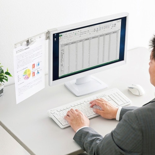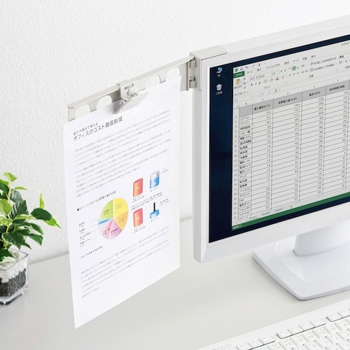 使用しない時には折りたたんで収納できますので、他の作業の邪魔になりません。ディスプレイの左右どちらでも取り付けられます。 |