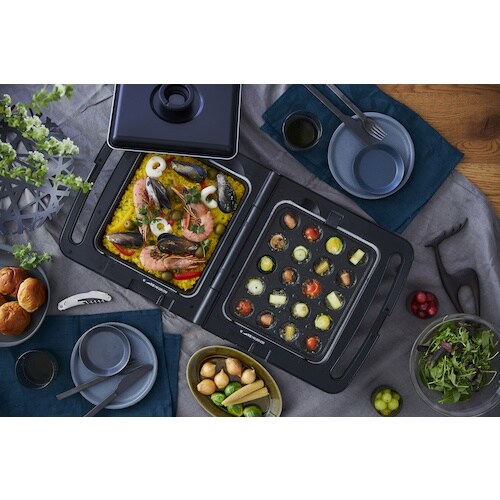 2枚のプレートで2種類の料理が同時にできる両面ホットプレートです。付属の蓋を使用することで、蒸し料理や煮込み料理もできるので料理の幅が広がります。卓上での加熱調理に。 |