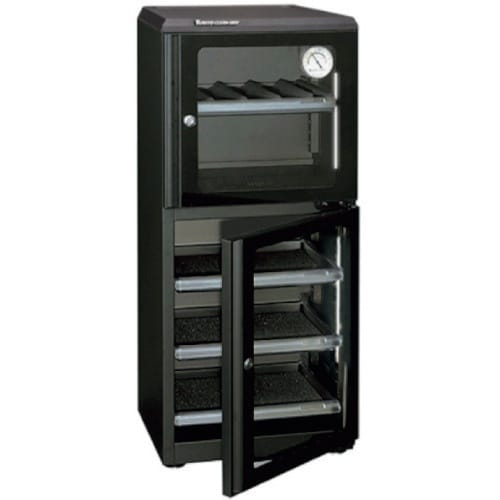 独自開発した光触媒機構の電子ドライユニット(日本製)を搭載しているため耐久性抜群です。除湿しながら庫内をクリーンに保ちます。乾燥剤の交換が不要でメンテナンスフリーです。 |