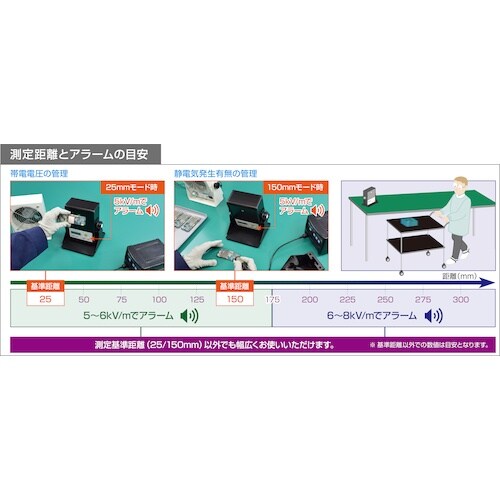 5kV/mを超える静電気の発生を感知(基準距離において)し、アラームで知らせるチェッカーです。 |