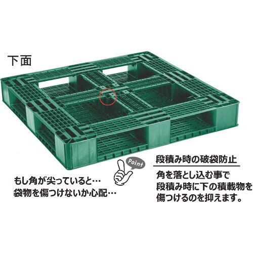 NPCパレットのベストセラータイプです。冷凍冷蔵環境下でご使用いただけます。PE材は冷凍冷蔵環境下での耐衝撃性に優れています。ラック保管対応です。(条件は必ずご相談下さい)用途に応じて色分けできます。 |