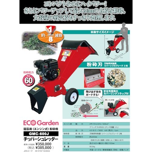 最大60mmの太枝を粉砕できるエンジン式粉砕機です。庭木の剪定などで出る大量の刈り枝を約1/8に減容できます。粉砕後は有機肥料として再利用や、可燃ごみとして出すことが可能です。 |