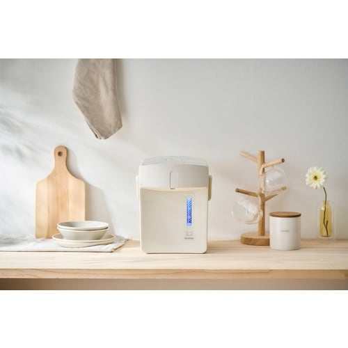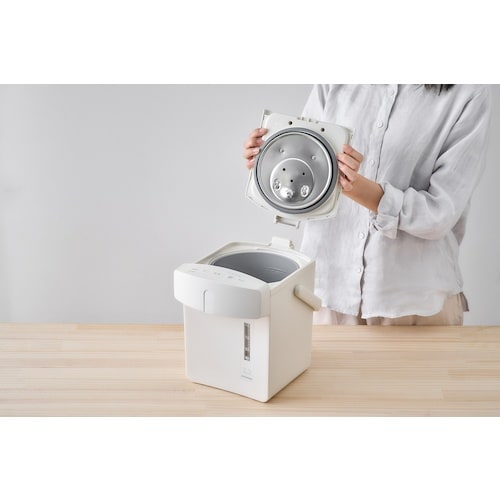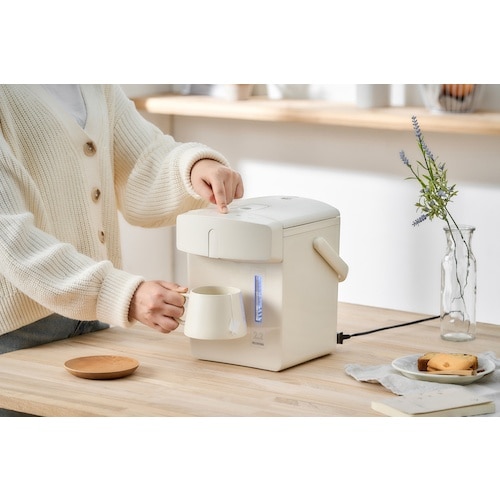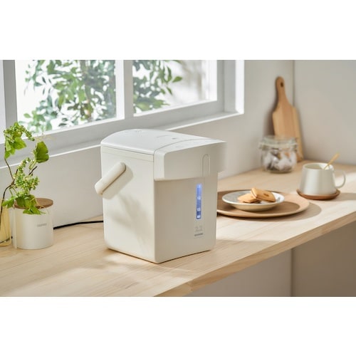 角型を基調としたスタイリッシュなデザインのジャーポットです。丸型デザインよりスリムでコンパクトに見えるデザインです。再沸とう機能付きで、ボタンを押せば保温中のお湯が再沸とうします。水の沸騰・保温に。 |