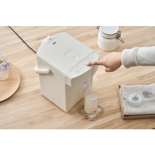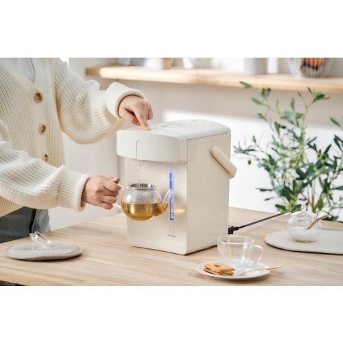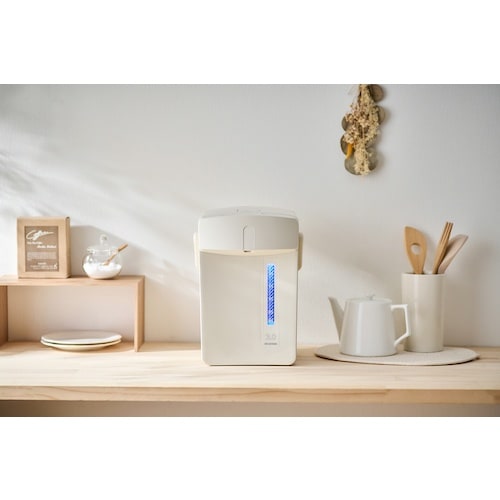 角型を基調としたスタイリッシュなデザインのジャーポットです。丸型デザインよりスリムでコンパクトに見えるデザインです。再沸とう機能付きで、ボタンを押せば保温中のお湯が再沸とうします。水の沸騰・保温に。 |