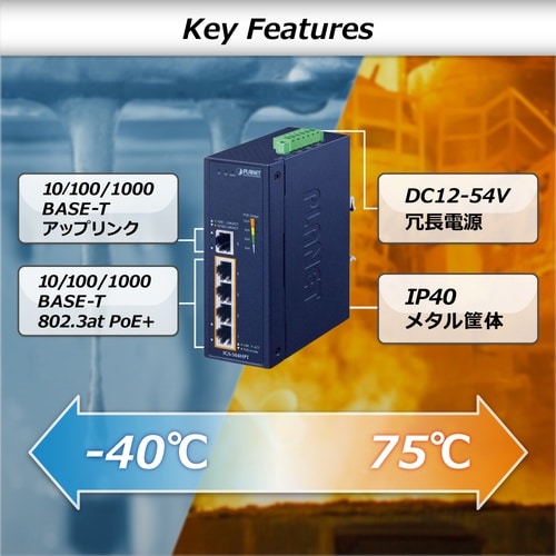 1000BASE−T 5ポート、IEEE 802.3at PoE+対応 産業用ギガビットイーサネットスイッチングハブ。 |