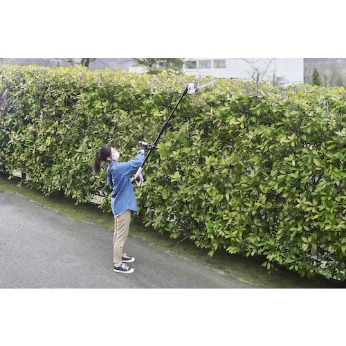 軽量で、可動式ハンドルと肩掛けストラップ付きなので、扱いやすいです。ヘッド部分が着脱可能なので、コンパクトに収納が出来ます。一般的な生垣に対応しして、最大1.4mー1.8m伸縮します。 |