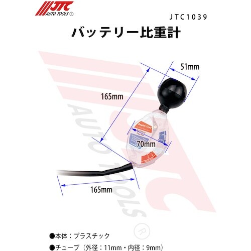 スポイト式のバッテリー比重計です。バッテリー液を吸い上げて、浮きの目盛りを読んで測定します。バッテリー液を吸い上げて、浮きの目盛りを読んで測定します。 |