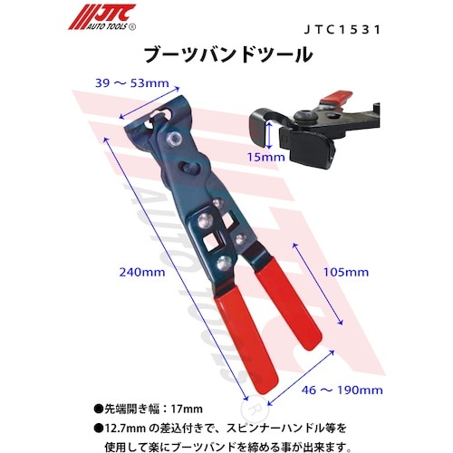 各種整備用途にお使いいただけます。12.7mmの差込付きで、スピンナーハンドル等を使用して楽にブーツバンドを締める事が出来ます。 |