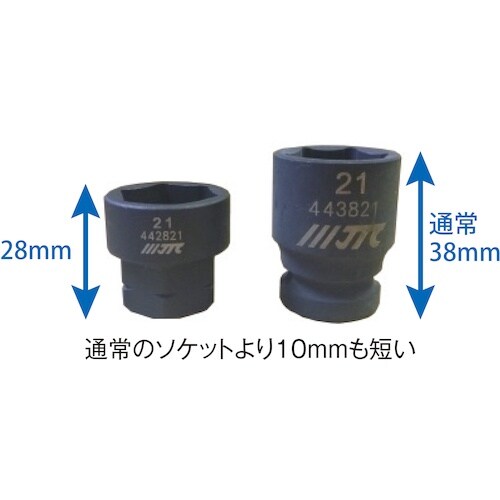 通常のソケットより10mmも短く、狭いエンジン回りで大活躍。別売りのJTC7656と組み合わせれば便利にお使い頂けます。 |