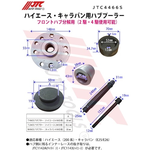 適合車種:ハイエース(200系)・キャラバン(E25/E26)ハブ側に残るインナーレースの抜き取りは、JTC1142A(キャラバン)・JTC1143(ハイエース)が必要です。 |