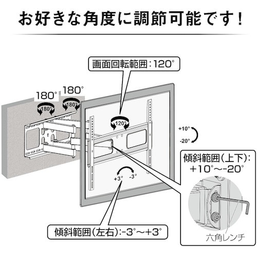 壁に取り付けて薄型の液晶テレビやディスプレイを設置することができる、ディスプレイ壁掛け金具です。壁に設置することで省スペースになり、インテリア性も抜群です。地震による転倒なども防ぐことができます。