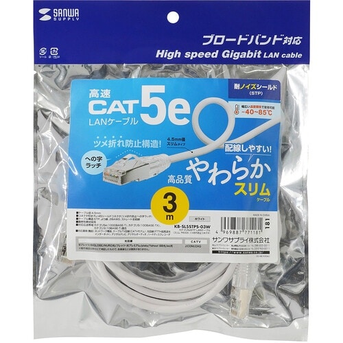 SANWA カテゴリ5eSTP LANケーブル(スリム、やわらか、ツメ折れ防止コネクタ) KBSL5STPS03W 1本