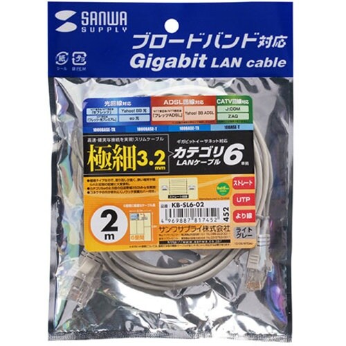 SANWA カテゴリ6準拠極細LANケーブル(ライトグレー、2m) KBSL602 1本