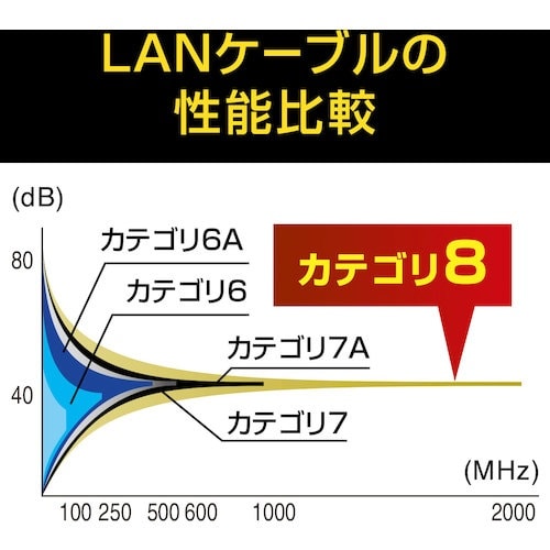 次世代イーサネット40GBASE−T(40Gbps)、25GBASE−T(25Gbps)に完全対応します。エンハンスドカテゴリ5の20倍、カテゴリ6の8倍の伝送帯域である2000MHzをクリアします。 |