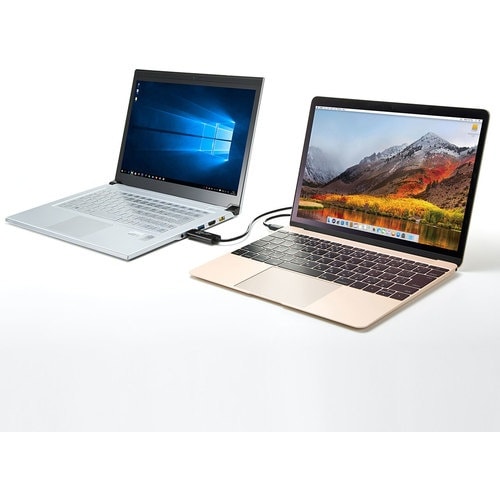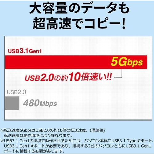 | 注意事項 | ※接続する2台のパソコンともUSB3.1/3.0に対応している必要があります。片方がUSB2.0ポートの場合は転送速度はUSB2.0準拠の転送スピードになります。2WindowsOS搭載機に限ります。(iPadには対応しません)3セキュリティ設定やUSBポートの使用に制限がされている場合、またはアプリケーションの起動・インストールに制限がかけられている環境では本製品のドライバのインストール及び操作が出来ないことがあります。詳しくはパソコン管理者にお問い合わせください。 |