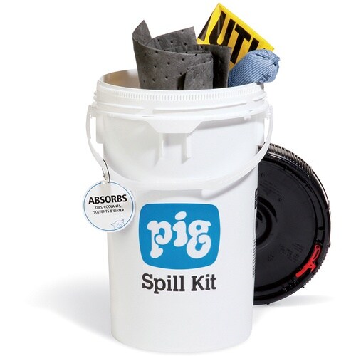 油、冷却水、溶剤、水などを吸収するピグ吸収材があらかじめセットされています。ポリエチレン製のバケツには、使用済み吸収材を一時的に保管することができます。回転式のフタは開閉が容易です。 |